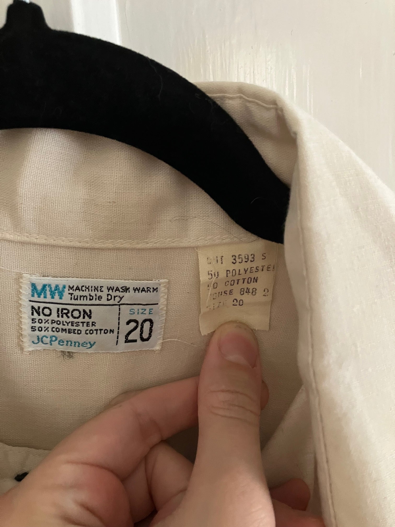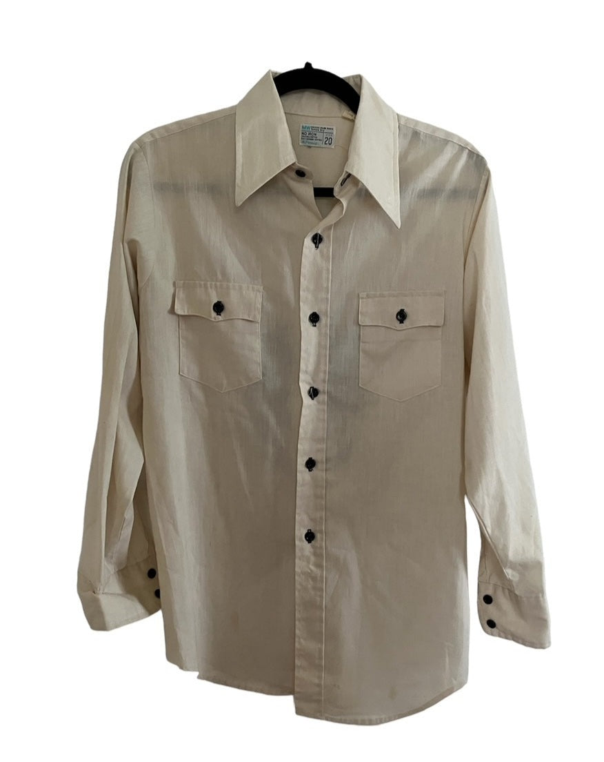 A vintage JC Penny button down shirt (off white/cream) with black buttons and a hand embroidered Bengal tiger on the back. Polyester and Combed Cotton. It is a size "20" but see measurements below for best fit. There are a few light stains towards the bottom but otherwise in good condition.