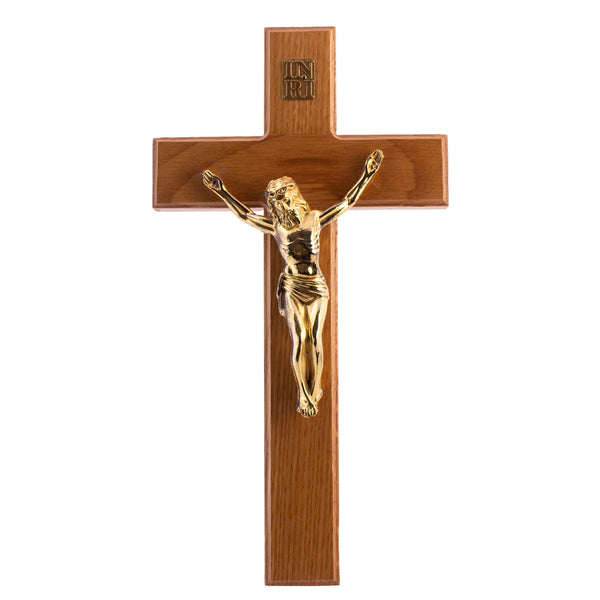 A lovely and simple wooden and gold tone Crucifix. This has a slot where it can be hung on the wall. In good condition. It is 10 inches long.